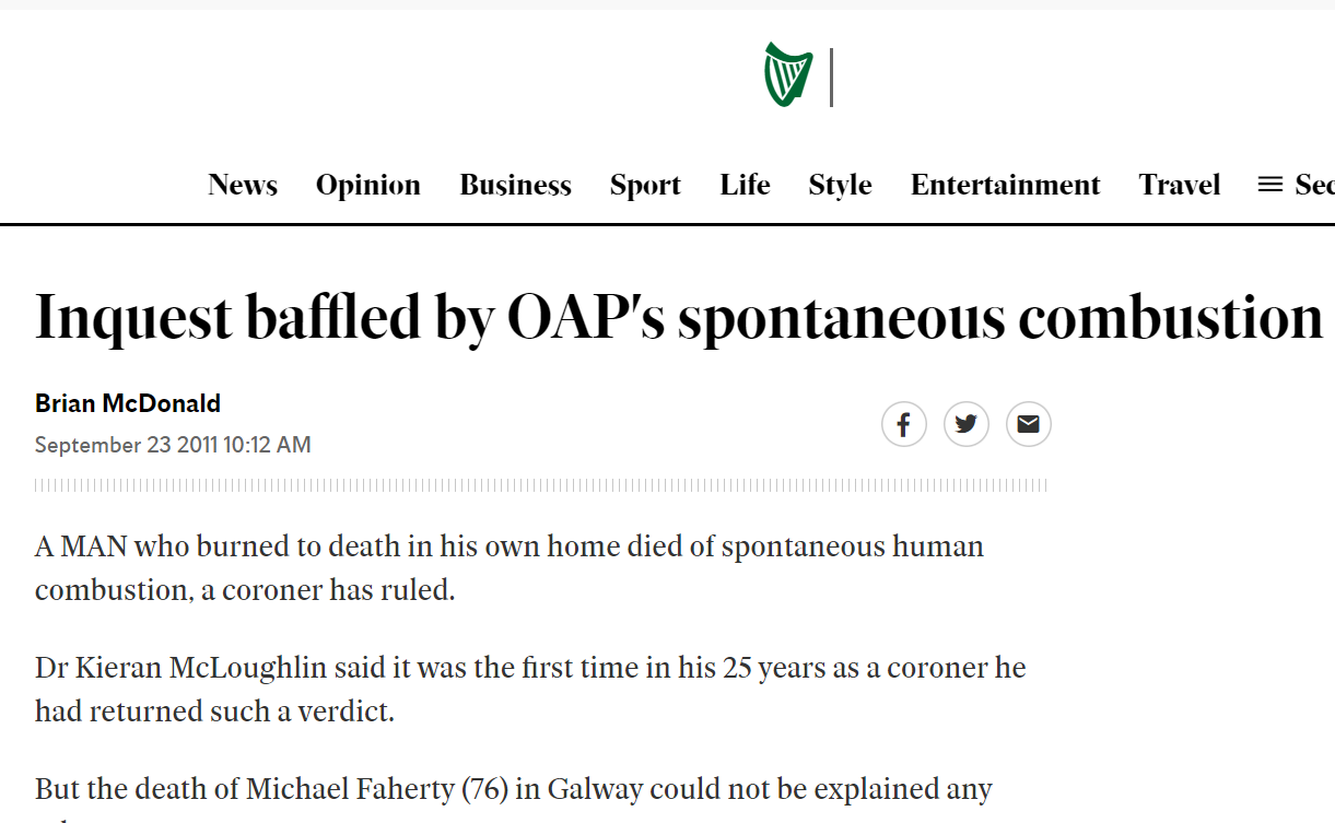 In 2010, the Irish Herald reported on the Case of Michael Flaherty, a 76 year old pensioner that was found reduced to a pile of ash. The coroner determined the cause to be spontaneous human combustion.