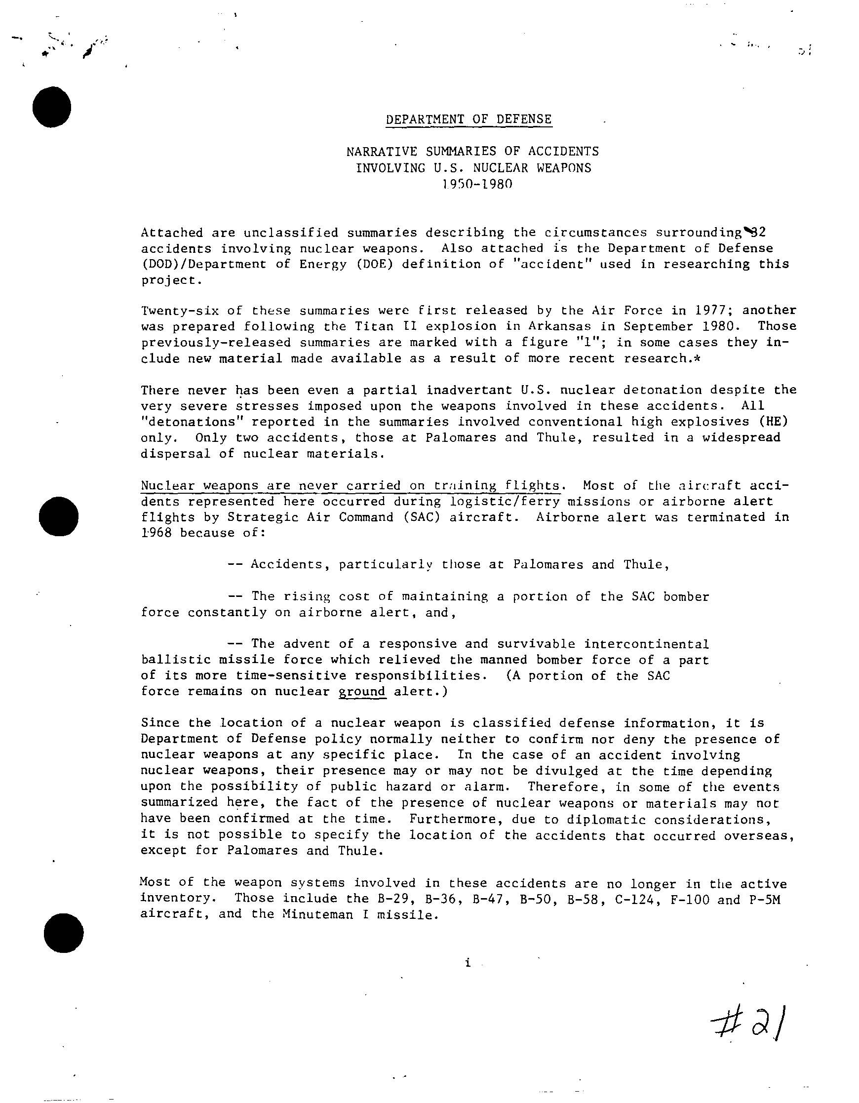 Since the location of a nuclear weapon is classified defense information, it is Department of Defense policy normally neither to confirm nor deny the presence of nuclear weapons at any specific place. In the case of an accident involving nuclear weapons, their presence may or may not be divulged at the time depending upon the possibility of public hazard or alarm. Therefore, in some of the events summarized here, the fact of the presence of nuclear weapons or materials may not have been confirmed at the time. Furthermore, due to diplomatic considerations, it is not possible to specify the location of the accidents that occurred overseas, except for Palomares and Thule.
