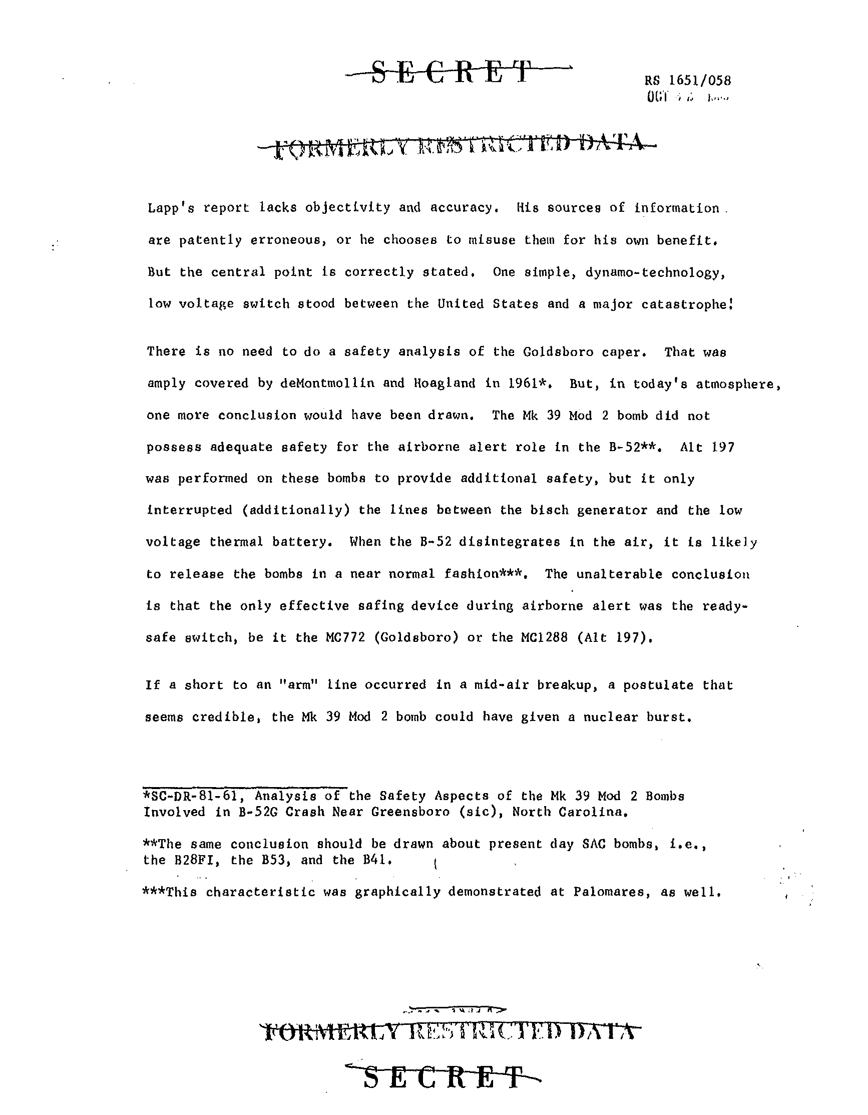 The notion of a “credible” detonation scenario at Goldsboro is confirmed in the above report: “If a short to an ‘arm’ line occurred in a mid-air breakup, a postulate that seems credible, the Mk 39 Mod 2 bomb could have given a nuclear burst.” In the footnotes, the author mentions widespread vulnerability: “[t]he same conclusion should be drawn about present-day SAC bombs, i.e., the B28FI, the B53, and the B41.”