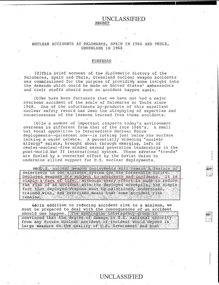 Other sources, like the Atomic Archives, define a Broken Arrow more broadly as any unexpected event involving nuclear weapons that results in accidental launching, firing, detonation, theft, or loss. All these definitions amalgamate different categories, leading, through the sorcery of semantics, to an erasure of context. There are events that fall through the cracks and entire spectra of nuclear mishap becomes invisible to us. Add to this the often kafkaesque fetish for redactions and refusal to honor FOIAs, it is perfectly reasonable to assume there are even funnier imbroglios we will never enjoy.