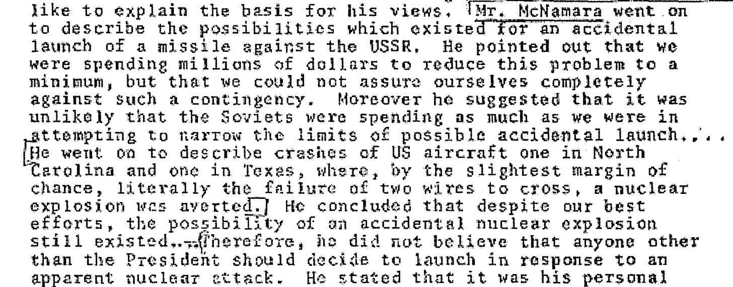 Then-U.S. Secretary of Defense Robert McNamara, in a 1963 document now declassified, characterized the incident with a statement of stark simplicity, noting that it was "by the slightest margin of chance, literally the failure of two wires to cross, a nuclear explosion was averted."